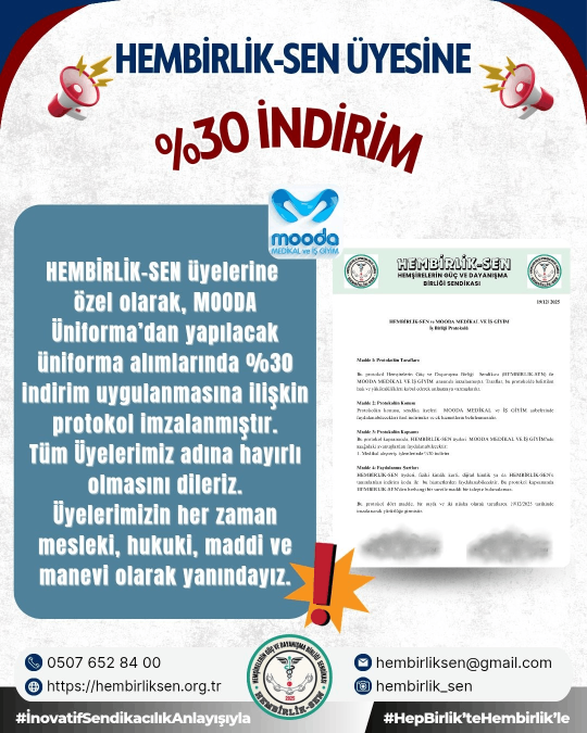 Üyelerimizin talepleri doğrultusunda, sektörün öncü markalarından biri olan MOODA Üniforma ile çok özel bir iş birliğine imza attık. Artık en kaliteli kumaşlar ve modern tasarımlar, sendika üyelerimize özel ayrıcalıklarla sunuluyor.