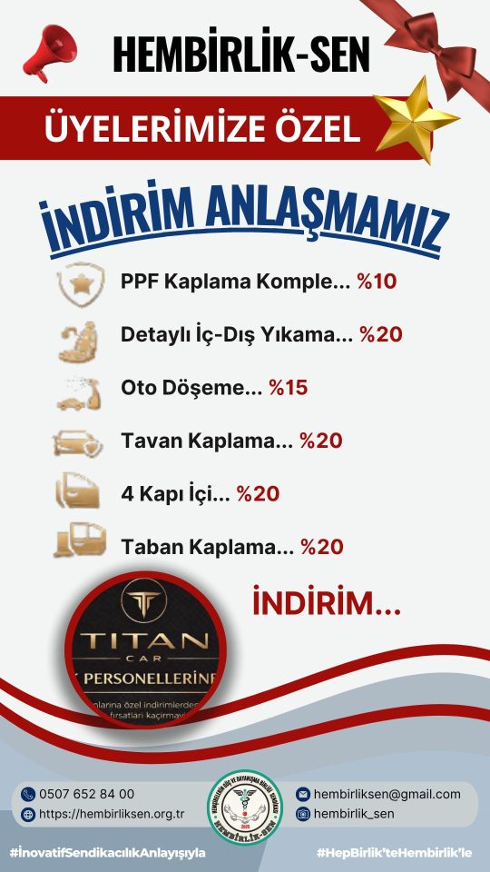 Üyelerimiz, sendika aidiyetlerini belgeleyerek bu hizmetlerden indirimli olarak yararlanabilirler. “İnovatif Sendikacılık Anlayışıyla” çıktığımız bu yolda, her alanda üyelerimizin yanında olmaya ve hayat standartlarını artıracak yeni anlaşmalar üretmeye devam edeceğiz.