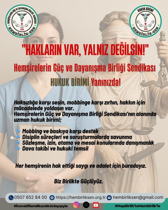 Hemşirelik, sadece tedavi ve bakıma yönelik değil, aynı zamanda yüksek sorumluluk ve yoğun emek gerektiren onurlu bir mücadeledir. Hemşirelerin Güç ve Dayanışma Birliği Sendikası olarak, bu mücadelede hiçbir üyemizin yalnız yürümesine izin vermemekteyiz.